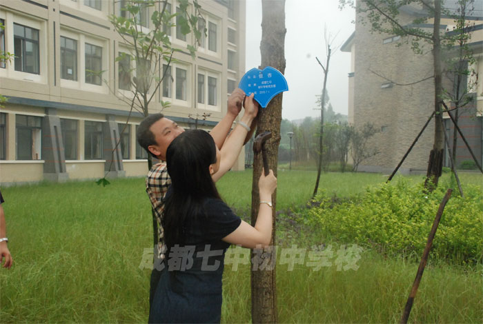 清凉的雨点,轻拂着朵朵伞花,欢声笑语伴随两校党员,边走边交流着教育的感念,谈论着生活的感受。来到校园的中轴林荫道侧,共同栽下成都七中初中学校全体党员捐献的一棵银杏树,大家齐心协力拉起银杏树的吆喝声,一铲铲泥土掀动的热闹声,把同根同源的银杏根植于肥沃的土壤里,也把相同的事业共同的愿望种植在大家期待的心田里。李笑非书记、杨斌校长在热烈的掌声中共同为银杏树挂上蓝色标牌。