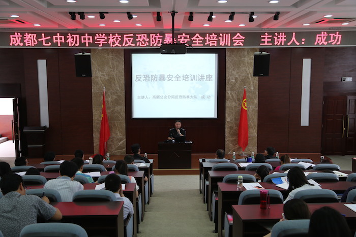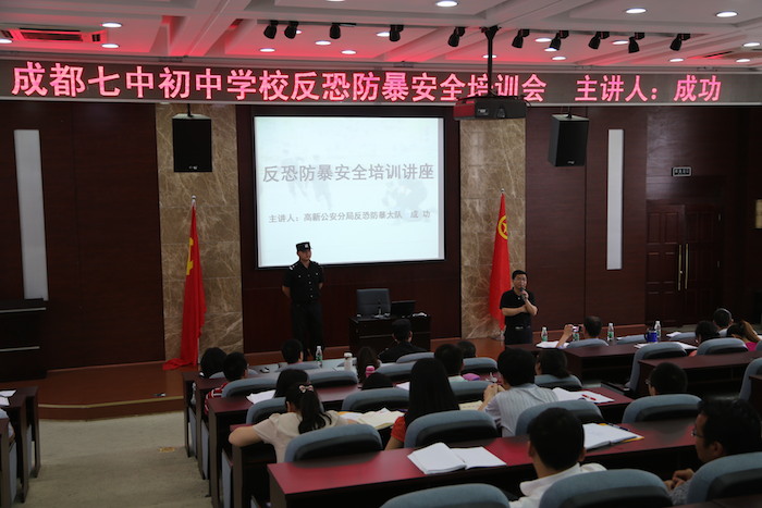 为了保护全校师生生命安全,增强反恐防暴意识,全面提高应对突发暴力事件的能力,5月27日下午,我校特邀成都市公安局高新区分局反恐防暴大队中队长成功警官,举办了反恐防暴安全培训讲座,邱兴华副校长主持了讲座。