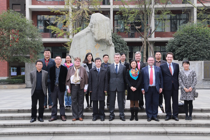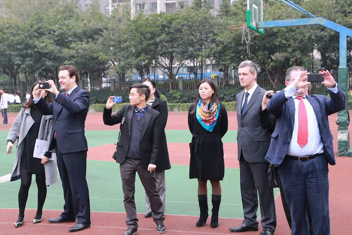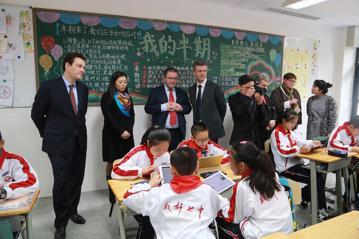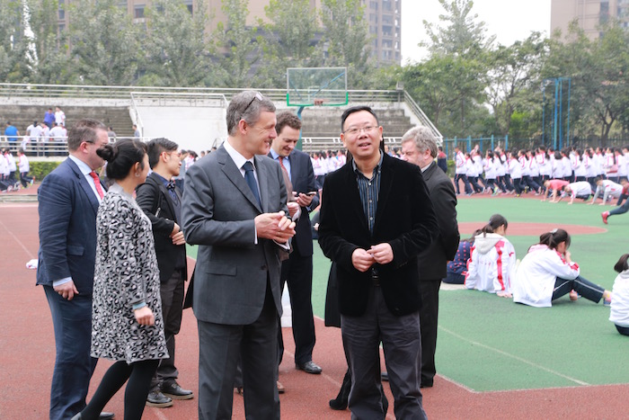 2015年11月17日上午,比利时大使马怀宇及随行教育官员来访我校。在我校访问期间,成都市教育局王志成副局长与比利时大使及其一行进行了友好的会谈。王局长向客人介绍了成都的发展以及成都教育的情况,比利时大使马怀宇介绍了比利时王国以及比利时的优质学校,表达了愿意与中国学校建立友好学校、实现师生互访交流的意愿。李校长热情地向比利时大使及官员介绍了我校办学情况,并重点介绍了七初的校园文化以及创客空间的建设等一系列学校未来的发展情况。