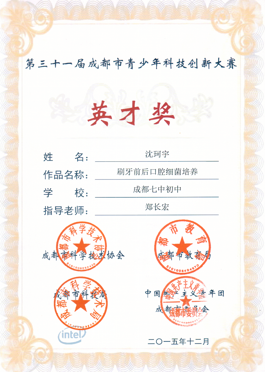 沈珂宇获得第31届成都市青少年科技创新大赛英才奖