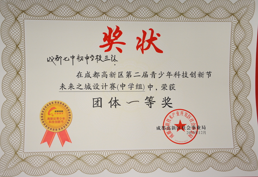 2015年12月4日-5日,我校在第三十一届成都市青少年科技创新大赛暨高新区第二届科技节中再创佳绩。我校共有138项作品参加本次成都市青少年科技创新大赛,获得了20多项一等奖。其中,沈珂宇同学的论文《刷牙前后口腔细菌培养》和曾鸣麒、邓州益、陈润明同学的程序设计《交通组织》获得了英才奖。在高新区科技节的“未来之城”设计比赛中,我校帅建明老师带领3支队伍共15位同学参加了比赛,获得两项团体一等奖。