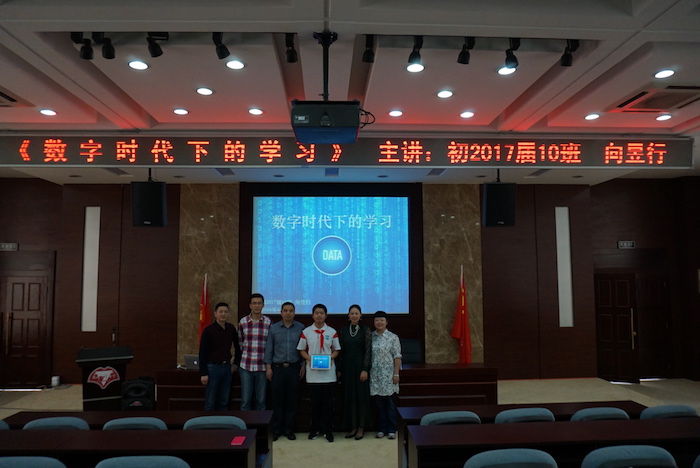 未来领袖讲坛,七初莘莘学子向往的平台!作为初二年级德才兼备的学生代表,向昱行同学骄傲地登上讲台,开讲---“数字时代下的学习”。