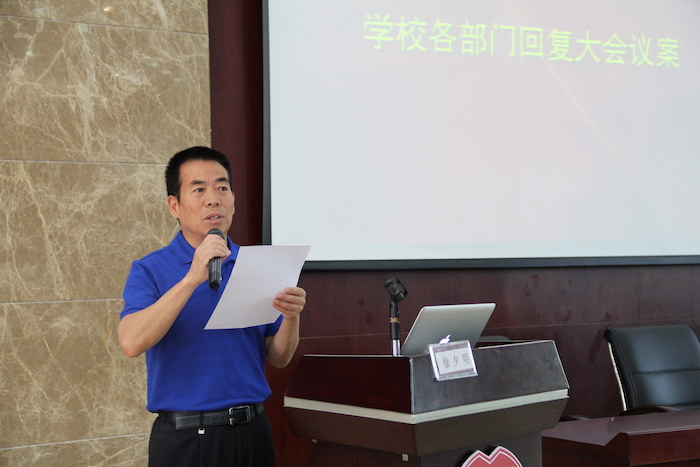 会议首先由教学管理部、行政后勤部、学生工作部的主任王岚老师、徐夕明老师、雷国亮老师对第一次会议的相关提案给予了高度评价并进行认真回复。