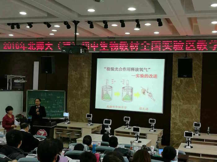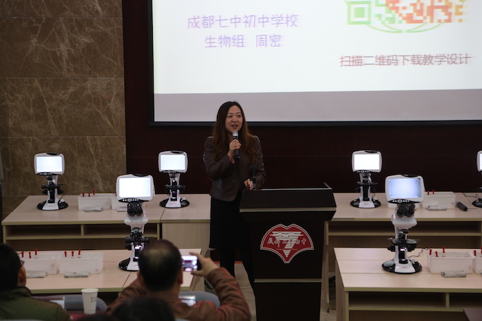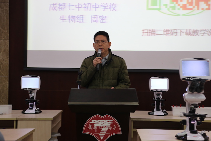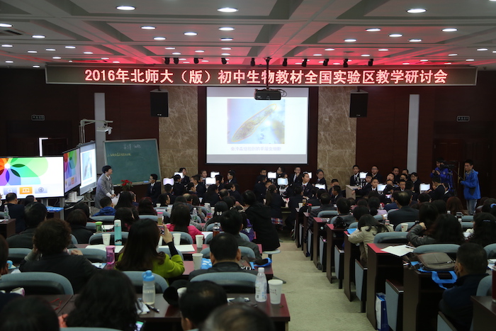 2016年11月11日, 2016年北师大(版)初中生物教材全国实验区教学研讨会暨成都七中初中学校生物组教育科研成果汇报活动在我校学术1厅隆重举行。北师大版义务教育生物学科教材主编、北京师范大学刘恩山教授,全国生物教学研究会学术委员李都老师,中国教研网执行总编朱立祥老师,北京四中特级教师陈月艳老师,北师大出版社基础教育分社社长李雪洁女士,四川省教科所何兴明主任,成都教科院罗清红院长,成都七中初中学校张新民副校长以及来自全国各地的生物教研员、骨干教师和成都市各区的教师代表近200人出席了本次研讨会。本次研讨会的主题是“现代信息技术在初中生物课堂教学中的应用”。