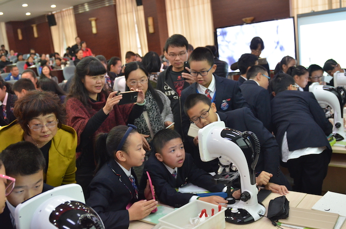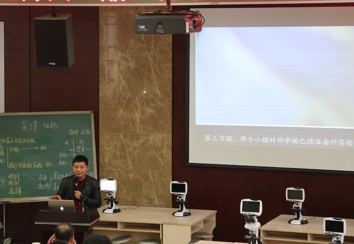 开幕式后,我校生物组周密老师执教了观摩课《细胞膜的功能》。“草履虫细胞染色实验”、“鲜花脱色实验”和观看“中性红染色草履虫较长时间后的变化”微视频等创新性学习活动的设计与实施,让学生充分感受了事实又获得了愉悦的学习体验。活动前引导学生进行的假设与推理、活动后引导学生进行的现象描述、原因分析与结论概括,则帮助学生进行了积极的高阶思维活动,精准建构了细胞膜功能的相关概念。数码显微镜观察草履虫细胞、扫码统计实验结果、iPad呈现实验现象对照、AirPlay投射演示实验等现代信息技术恰当、流畅地运用,也助力了学生学习目标的顺利达成。精彩的课堂得到了与会人员的高度认可。