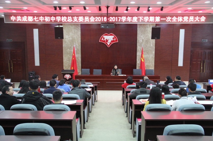 在新学期的第二周周二下午例会时间,学校开展了成都七中初中学校总支委员会2016-2017学年度下学期第一次全体党员大会。会议由党总支书记李笑非校长主持,部署了本学期的党务工作安排。会上,李校长强调全体党员要认真学习,落实两学一做工作。