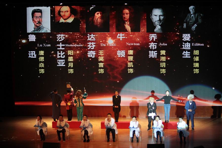 2班表演的《世纪大咖秀》则是另一种氛围,“牛顿”“毕加索”“鲁迅”等伟人相继出现在观众的视线里,真实惊喜连连。
