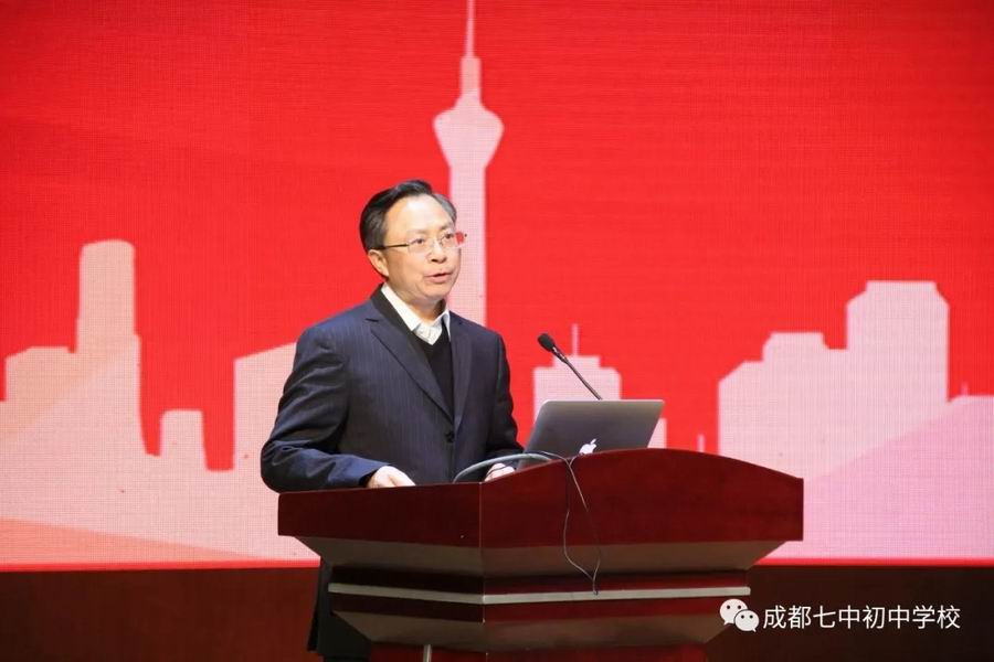 首先请到的是四川省教育厅基教处何庆处长致辞。何处长表达了对参会嘉宾的欢迎,列举了四川教育发展的基本状况,促进教育从“均衡化”到“优质化”发展,推进“优质特色”与“高位均衡”发展。同时谈到了成都七中初中学校十年来的健康发展与高位引领,表示对学校十年校庆的祝贺。