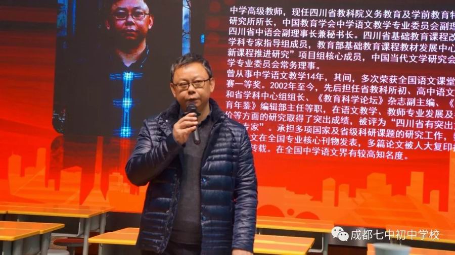 接下来是成都市教育局左华荣副局长讲话,左局长受刘强局长的委托,代表成都市教育局分析了成都教育的现状和创新发展,强调了本次学术会议的意义,肯定了成都七中初中学校十年的办学成绩,并提出希望,总结出规律,总结出思想,总结出智慧。