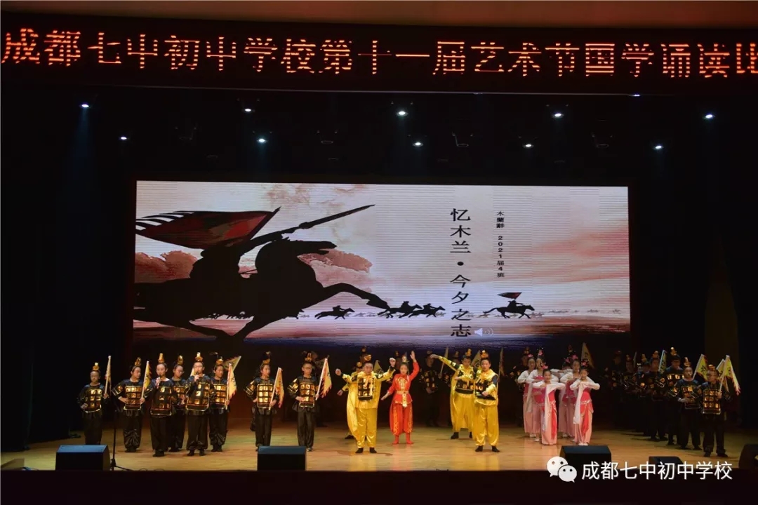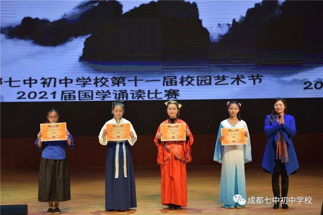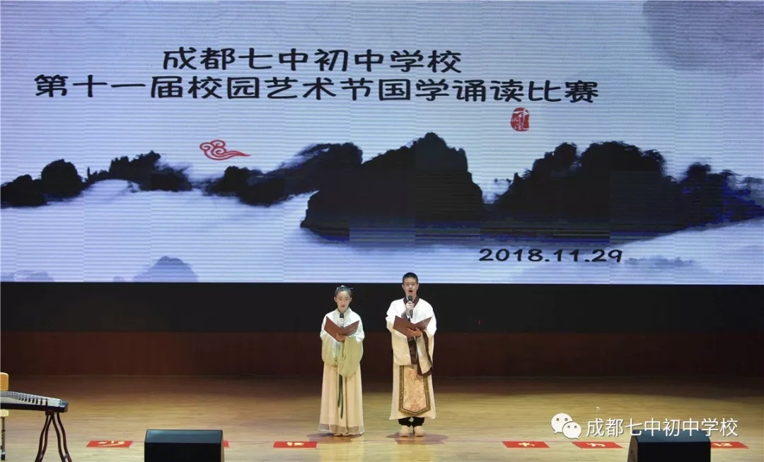 渊博的知识来自日积月累,从容的智慧来自经典阅读。许多时新的东西总是短暂的,那点光芒很快便会熄灭,而经典作品把最内在的价值传递给人类,持久地流传。悠悠中华上下五千年,奔流的时光留下了许多经典文化遗产,在今天,弘扬中华优秀传统文化成为了我们新时代青少年义不容辞的责任。2018年11月29日,成都七中初中学校迎来了第十一届国学诵读主题活动,2021届全体学生参与了本次比赛。