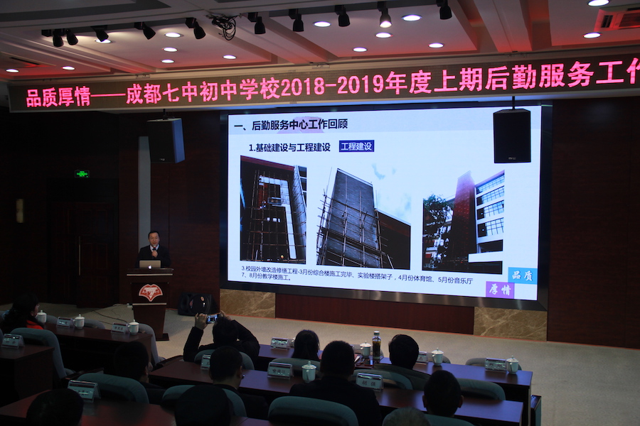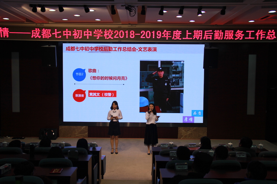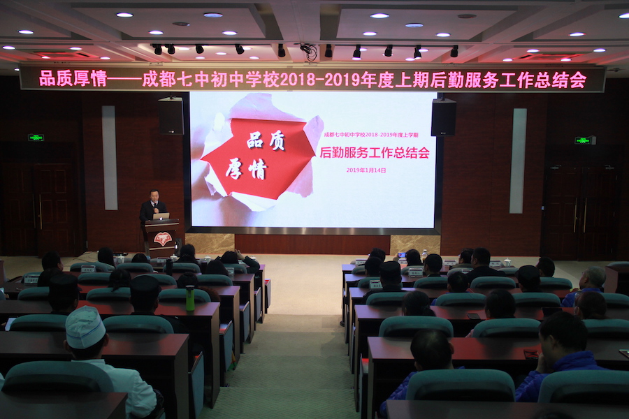 此次总结会回顾了过去一学期学校后勤服务工作,肯定了后勤工作取得的成绩,并反思后勤工作存在的问题与不足,通过此次总结会让后勤服务团队进一步统一了思想,提高了认识,理清了思路,有利于推动后勤服务工作在新的一学期更上新台阶。此次总结会的主题是品质与厚情,品质是指的工作要求和工作目标,厚情是指的深厚感情,学校希望通过此次形式多样的总结会凝聚人心,增强全体后勤服务人员的存在感和价值感,增强全体后勤服务人员对学校的认同感。总结会上成都七中初中学校后勤服务中心郑刚主任做了学校后勤工作总结,物业公司项目经理胡强先生做了物业管理工作总结。