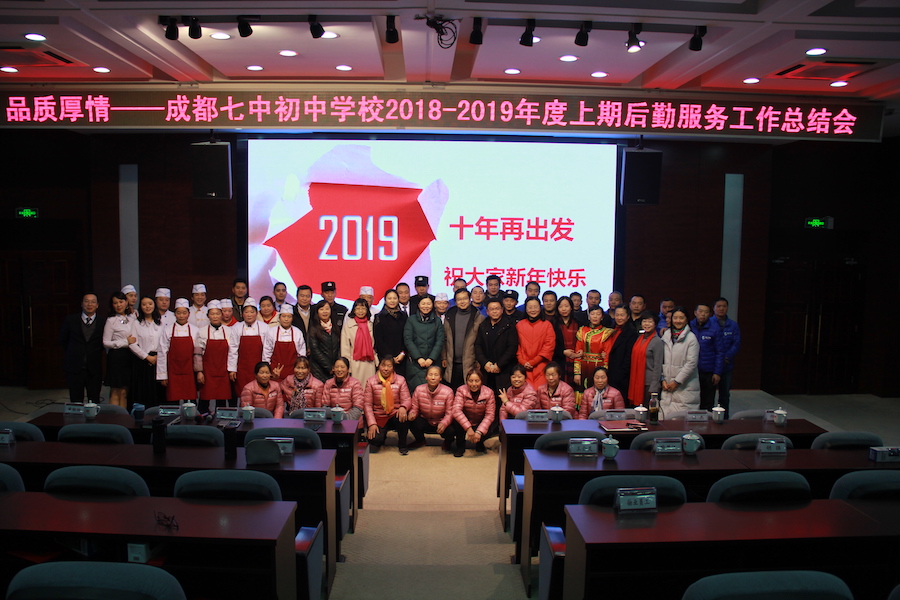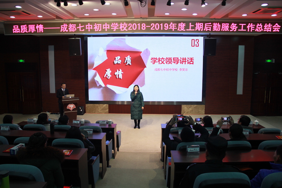 2019年1月14日下午,以“品质·厚情”为主题的成都七中初中学校2018-2019年上学期后勤工作总结会在学术一厅召开。学校后勤服务中心职员、学校食堂员工、物业管理公司员工共70多人参加了会议,成都七中初中学校全体校级领导、部门负责人均出席了此次总结会。会议由后勤服务中心郑刚主任主持。