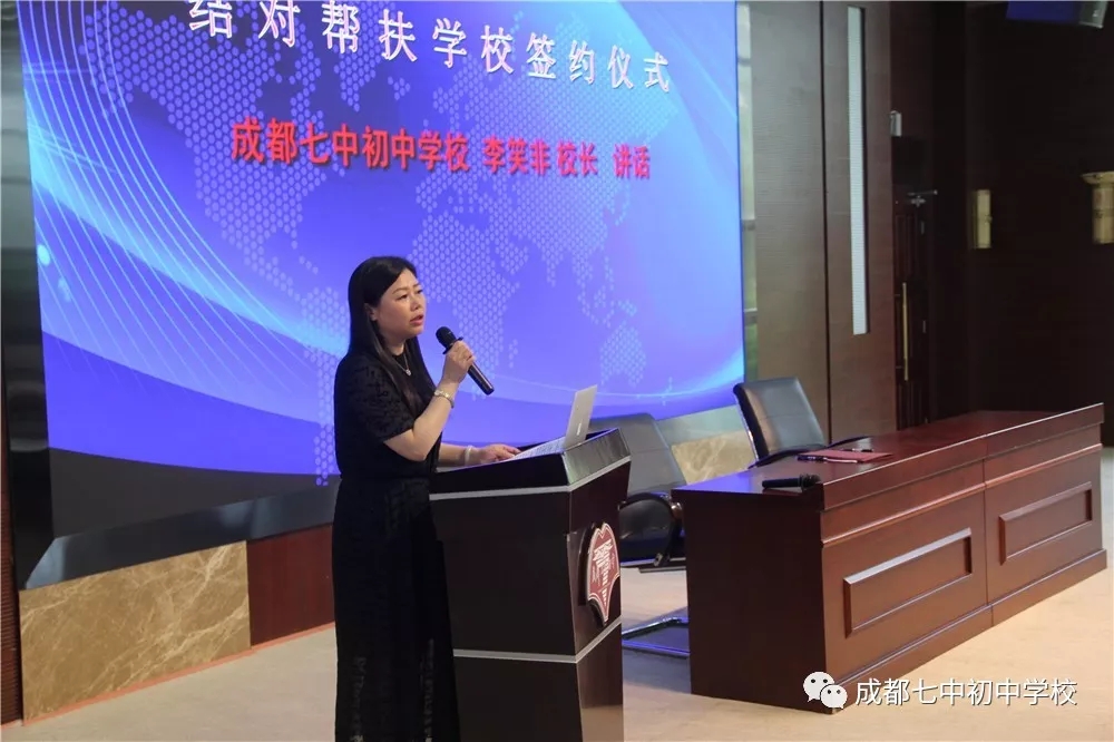 接下来举行了成都七中初中学校与康定市第三中学、九龙县沙坪中学结对帮扶仪式。校际之间签订了接对帮扶协议,并举行了隆重的授牌仪式。