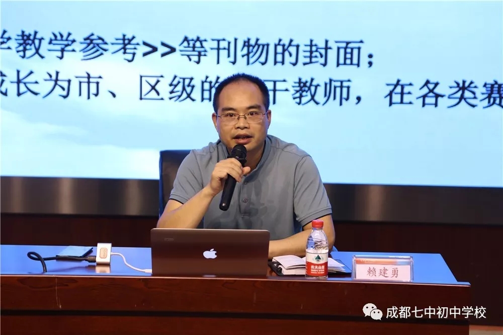 成都七中初中学校数学教研组长赖建勇老师作《团结 进取 奉献》专题报告,呈现出数学教研组教学过程中的严谨、科学、无懈可击的实践和对七初“高标准”的坚守。每一滴水只有融入大海才不会干涸,一个人只有与团队协作,才能用有限的人生活出最大的格局。