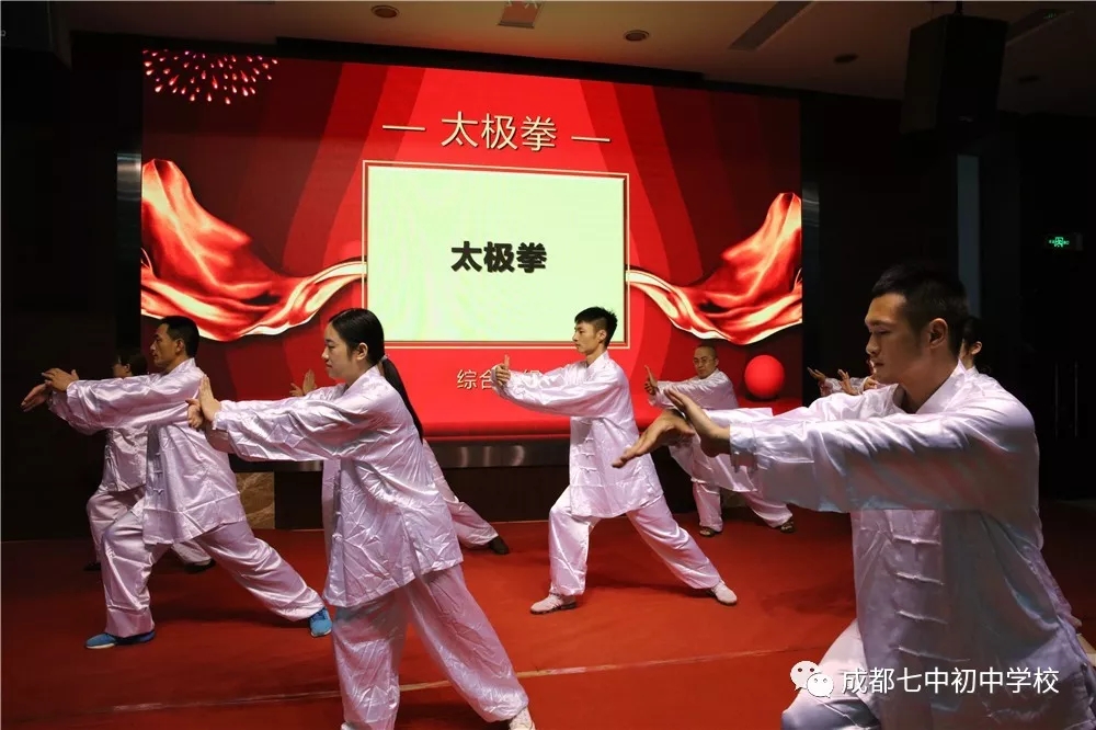 分组展示之后,成都七中初中学校全体领导及新教师开展了精彩纷呈的联欢晚会排练。晚19点30分,教师联欢晚会拉开了帷幕。晚会伊始,由综合一组带来的刚柔并济的太极拳,仙风鹤骨,赢得满堂彩。