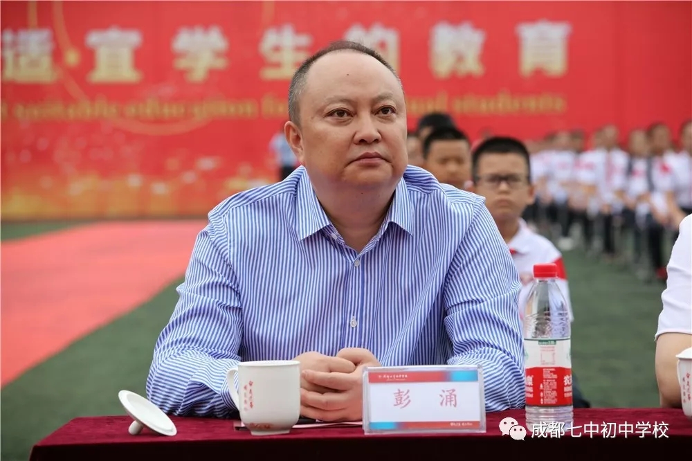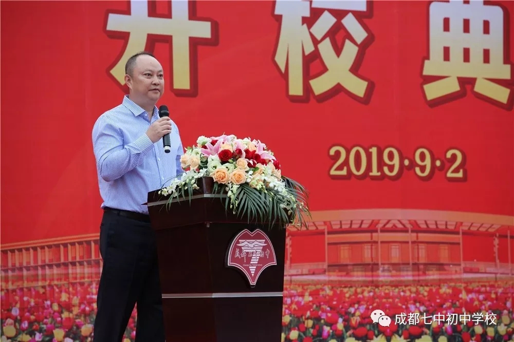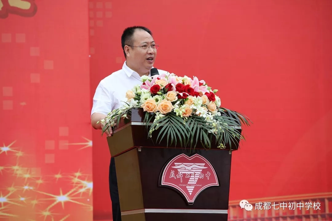 成都高新区社区发展治理和社会事业局局长彭涌致辞。他赞赏七中初中办学十年,成绩显著,有口皆碑。他希望领导班子带好头,起好步。全体老师凝心聚力,同心同德,贡献智慧力量,助力七初成长,助力高新教育发展,开创高新教育新篇章!
