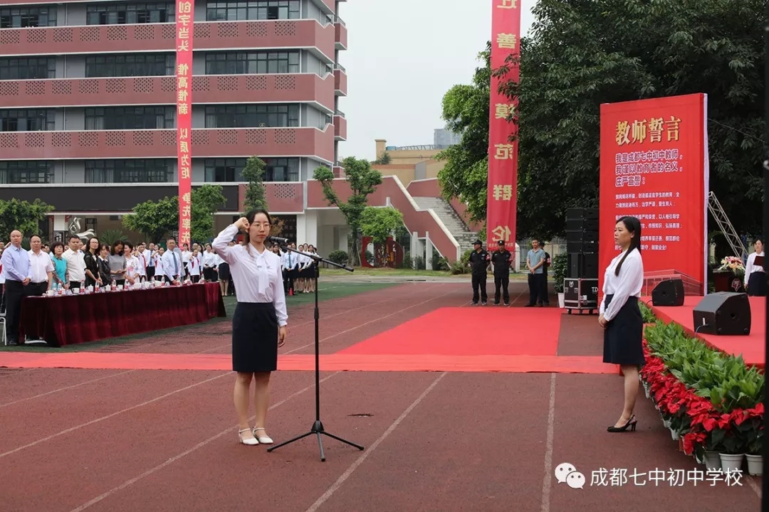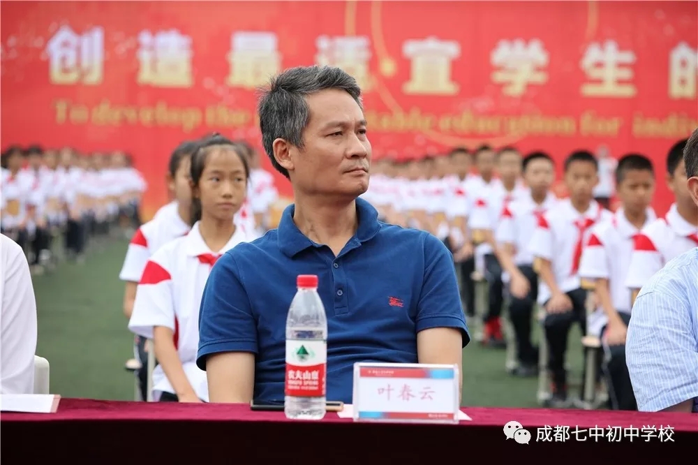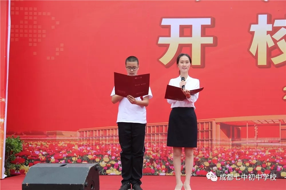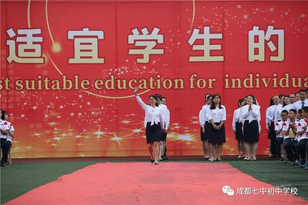 会场隆重而热烈,每一处布景,无不彰显着七初的魅力与力量。成都七中初中学校的校训:审是迁善、模范群伦,醒目地立在主席台两侧,成都七中初中学校的办学追求:创造最适宜学生的教育,成为会场的背景,“选择七初,就选择了一条艰苦奋斗的成功之路”、“七初没有超人,只有超人的意志”、“你有多大能耐,给你多大舞台”等而耳熟能详的七初金句飘升在会场的四周。现场的嘉宾、全体教师和家长代表用热烈的掌声欢迎孩子们的入场。