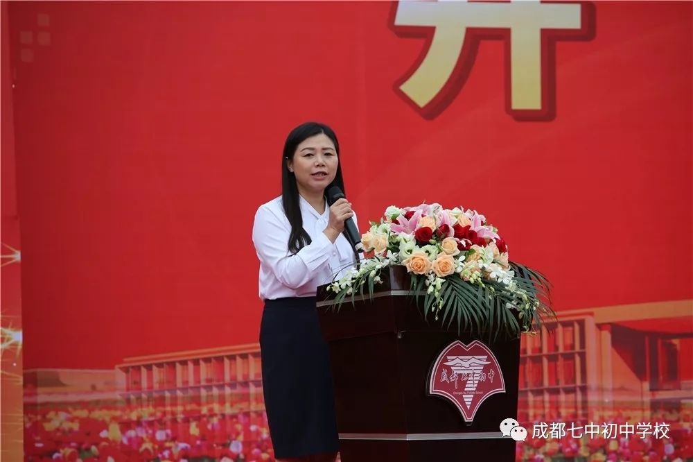 成都七中初中学校校长李笑非致辞,她表示:从今天开始,成都七中初中学校将踏上新的征程,两个校区将携手共进、高度融合、并驾齐驱,再创辉煌。未来已来,使命必达,我们将继续坚守以人为本的理念,努力创造最适宜学生的教育,我们要脚踏实地,勤鞭快马,与时俱进,智慧创新。