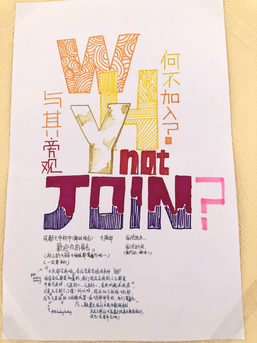 在七初,有这样一群有责任有担当的同学们,聚集在我们的大队部、学生会!近期,七初锦城校区第一届大队部、学生会招新了。