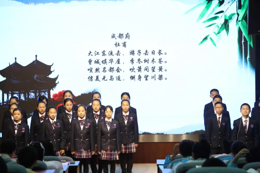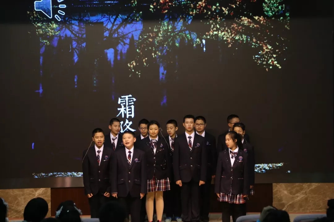 一班诵唱了马致远的《天净沙秋思》和余光中的《乡愁》。他们以游子思念家乡,渴望回归故里,祖国统一为主题。
