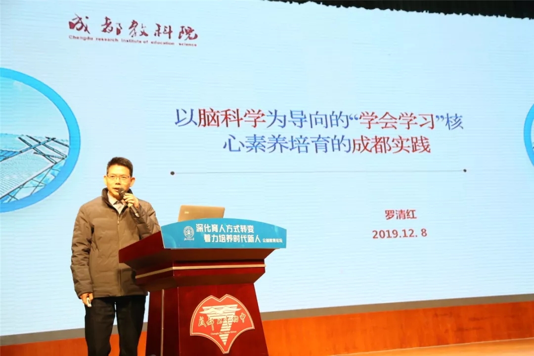 成都市教科院罗清红院长做了主题为《以脑科学为导向的“学会学习”核心素养培育的成都实践》。罗院长分享了了他个人对教育前沿科学领域脑科学的思考,并向与会嘉宾汇报了脑科学研究与学校教育实践的深度融合在成都中学教育领域的开展情况。