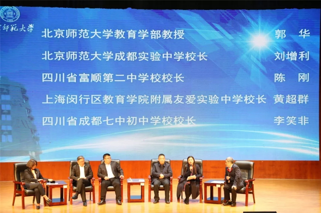 在专家互动交流环节,来自北京师范大学教育学部的郭华教授、成都七中初中学校李笑非校长、北京师范大学成都实验中学刘增利校长、上海闵行区教育学院附属友爱实验中学黄超群校长、四川省富顺第二中学校陈刚校长阐述了各自对“深化育人方式转变,着力培养时代新人”的独到见解。