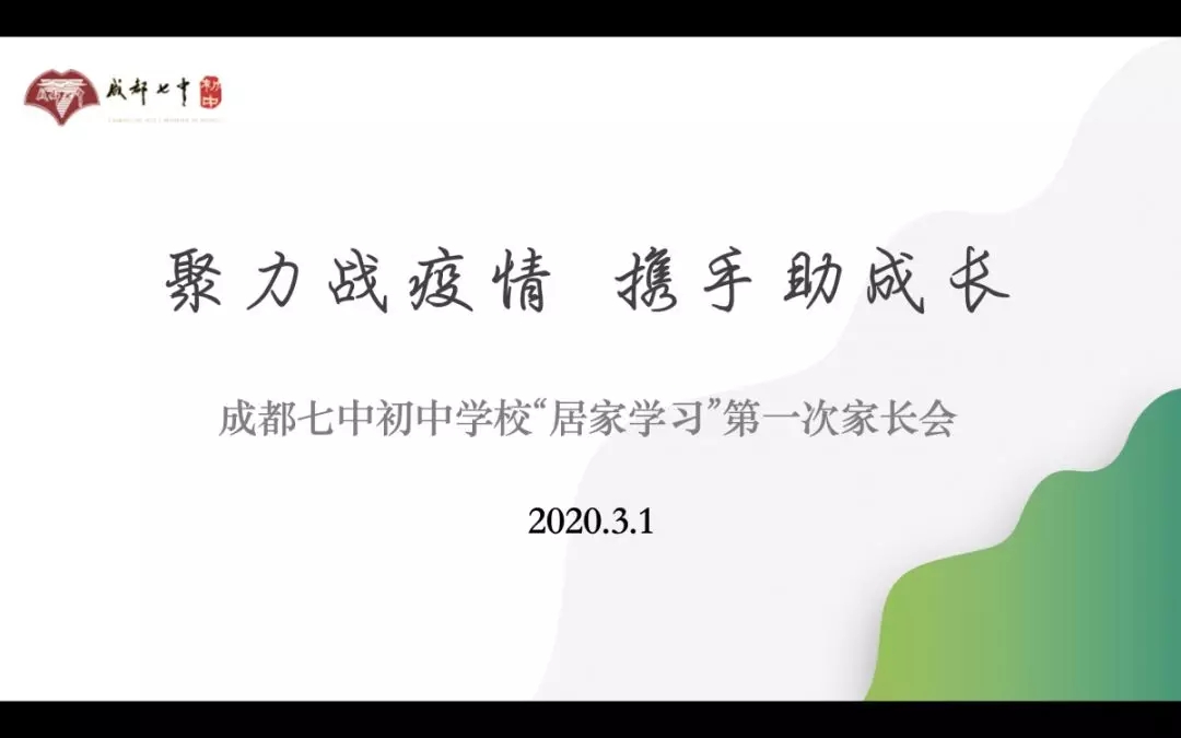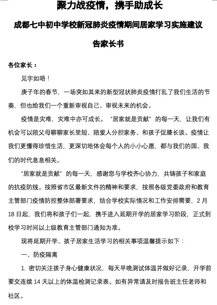 2月16日,通过各班级群发布《聚力战疫情,携手助成长——成都七中初中学校新冠肺炎疫情期间居家学习实施建议告家长书》,建议七初的家长们借助这次疫情的生活教科书,重视对孩子的生命教育、自主管理教育、职业生涯教育、责任与担当教育、感恩教育、独立思考的教育等。