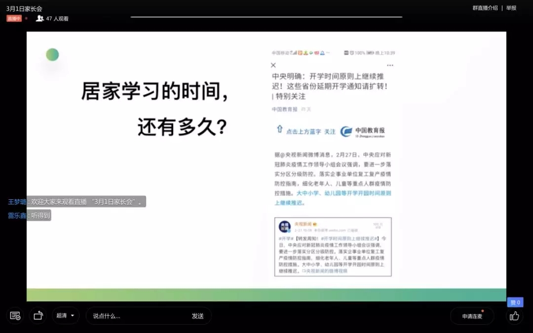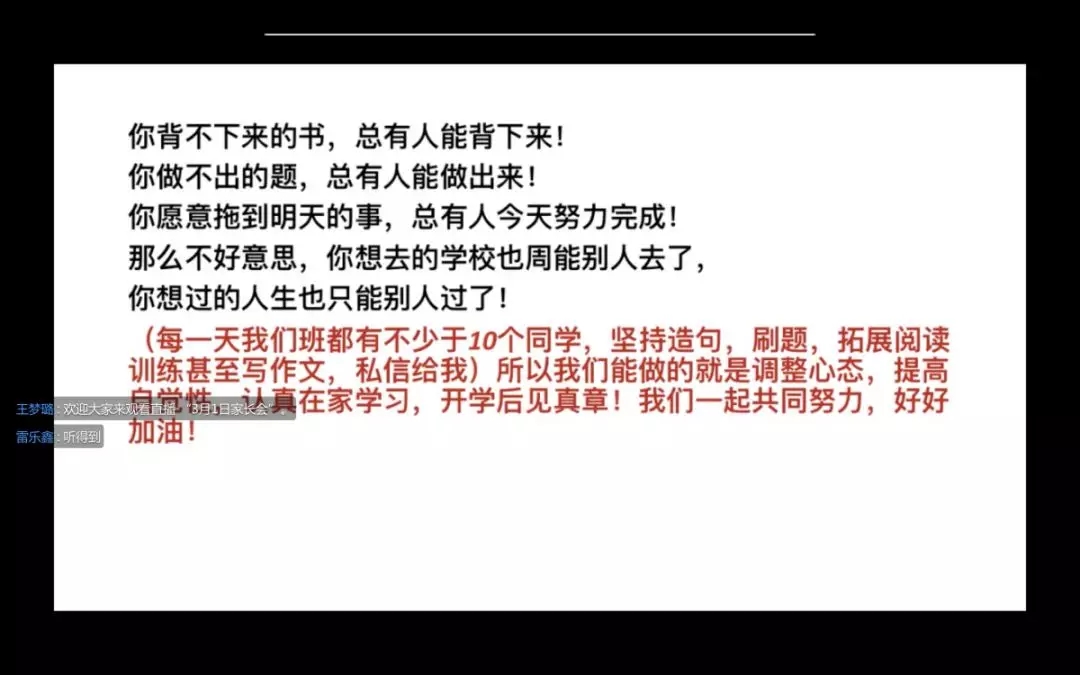 两周的居家学习,孩子们的状态良好,却也存在差异。为了更好地助力孩子们成长,学校于3月1日20:00召开本学期第一次线上家长会,与家长就居家学习的方向和细节形成更大合力!