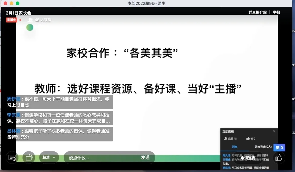 家长会首先交流了学生近期的居家学习情况。通过网络数据、班级日志 、学生互动、教师家长反馈等途径,对学生居家学习的整体情况与家长进行了充分的沟通交流。