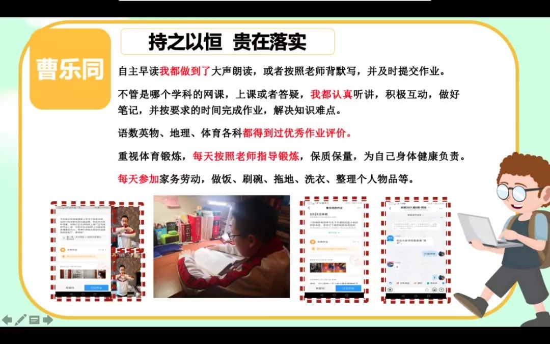 最后,学校和家长、学生进一步达成共识:家校合作,“各美其美”。虽然大多数老师没有在线教学经验,但一定会不断完善,精心备好课、上好课,以引领学生综合素养的提升。特殊时期,每个家庭都会付出更多的时间和孩子呆在一起,面对这种特殊的学习方式,家庭要提供合适的学习环境,学生和家长都要养成与之相适应的学习和生活习惯。我们要有更高的学习自觉性、自律性和更强的专注力,为下一阶段学习顺利进行,建议家长和孩子们构建和谐的亲子关系,共同商议并制定居家学习的家庭公约,大家共同遵守,如此才能和孩子一起成长,经历一段一生都难忘的时光。