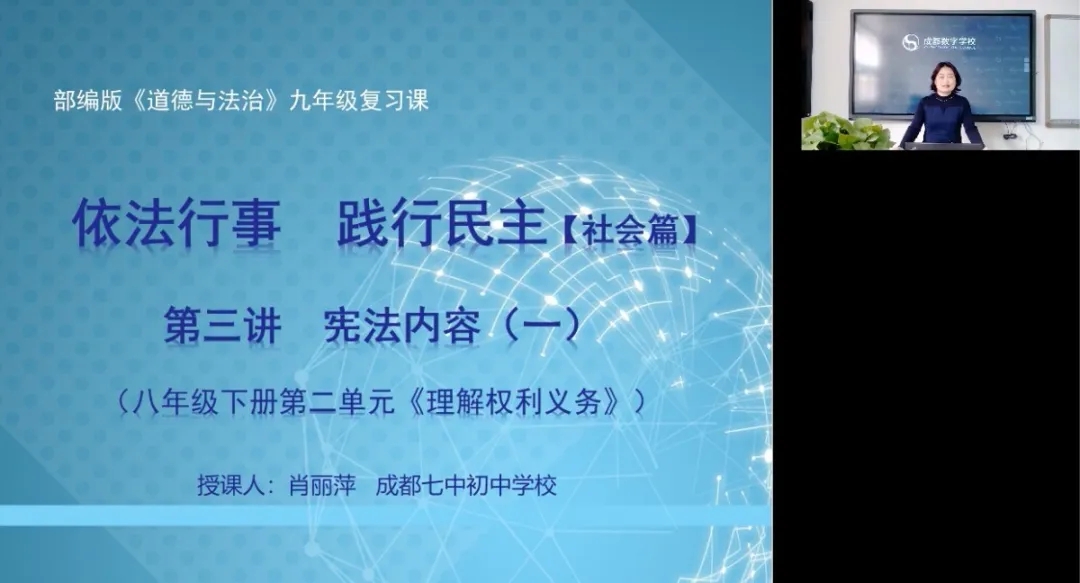 道德与法治组肖丽萍老师,2月18日-4月5日期间,在成都数字学校“停课不停学”九年级在线教学道德与法治课堂上直播课5节。课题内容《风云世界》、《依法行事,践行民主》、《文明与家园》、《和谐与梦想》。