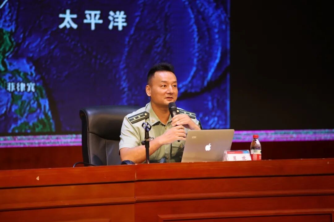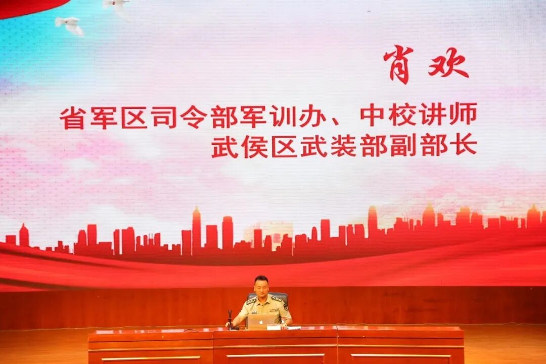我们的“国防第一课”:成都市武侯区人民武装部肖欢副部长为同学们作主题为《中国周边安全环境》的国防教育讲座,为同学们上了“国防第一课”。肖部长由古引今,以“盛世危图”——清明上河图中所反映出的忽视安全的问题,谈到中国当今周边安全环境之情况。在幽默风趣的讲解中让同学们对当今国际形势有了更多的了解,同时,他也鼓励学生们要用努力和奋斗保卫祖国,用实际行动践行新时代青年学子的责任与担当。