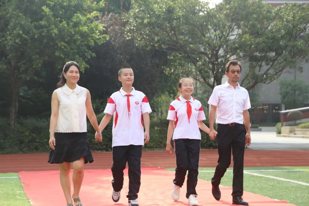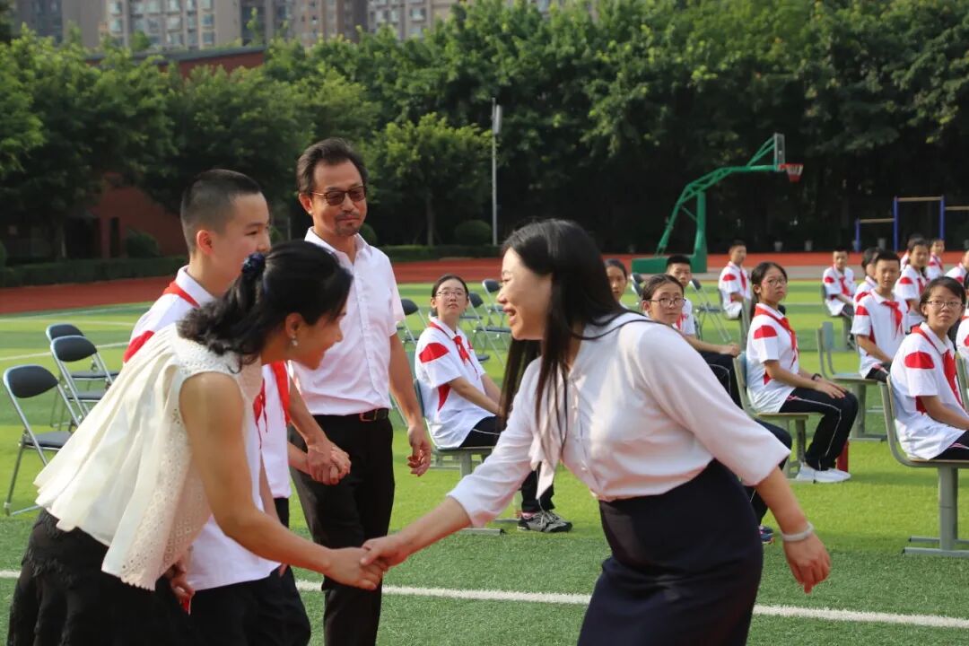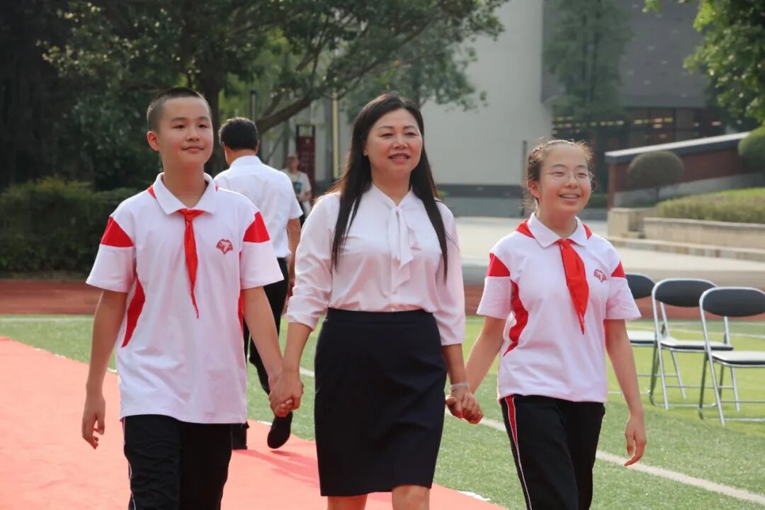 庄严神圣的新生交接仪式在现场师生、家长与炙热骄阳的见证下开始了。李笑非校长迈着坚定的步伐,走向家长代表,从家长手中接过孩子,与孩子们深情拥抱,牵着他们的手,把他们交到2023届分管领导及年级组长的手中。这一刻,学校对学生、家长和社会的郑重承诺都饱含在这隆重而温情的交接仪式里。