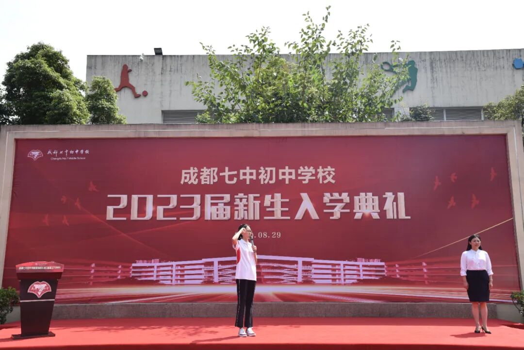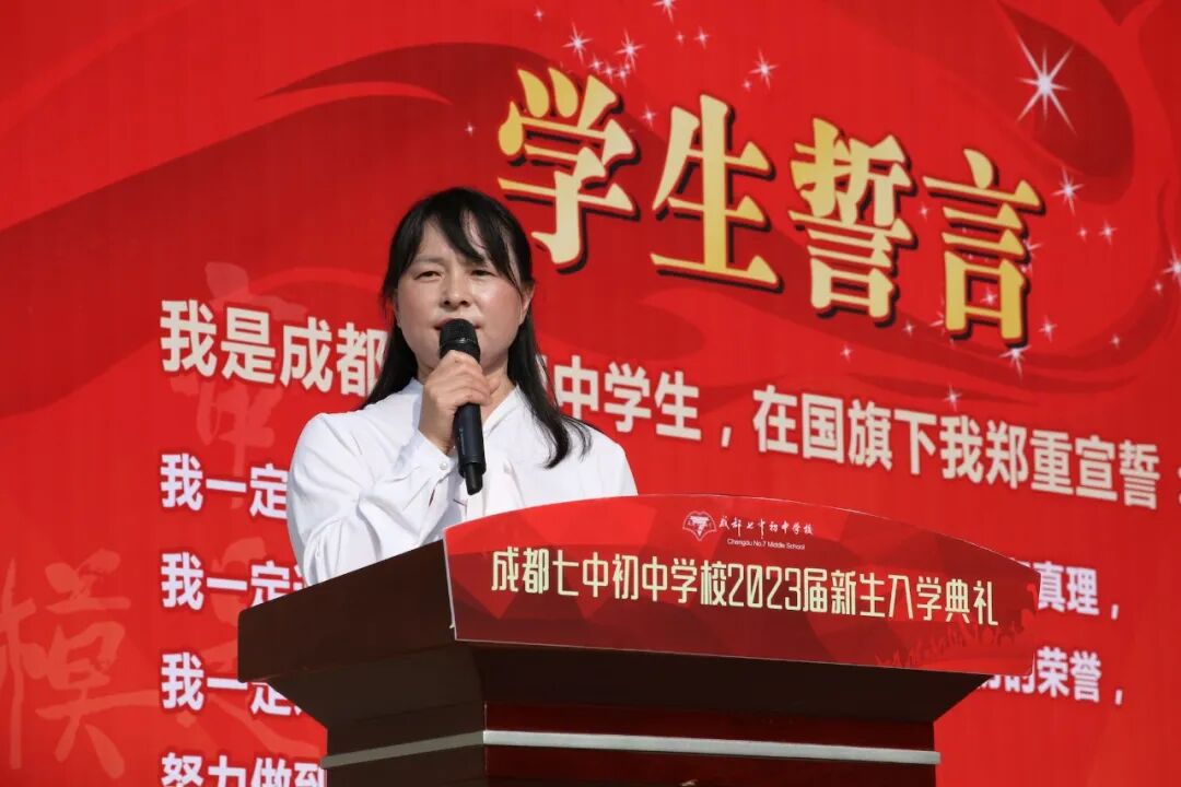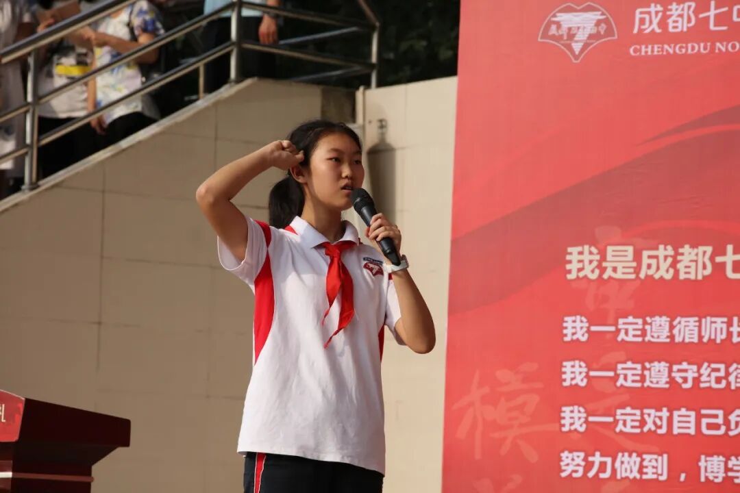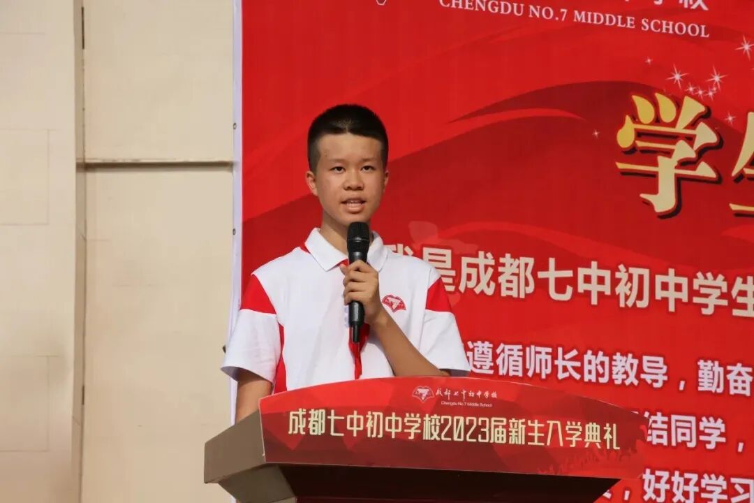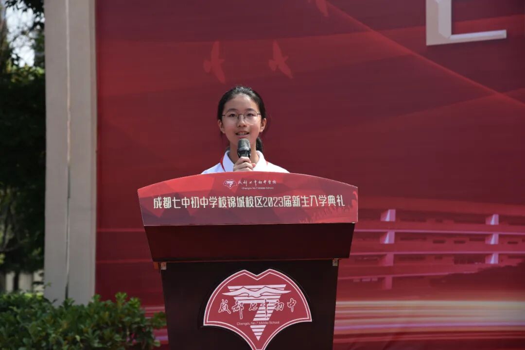 天环校区2023届10班刘俊希同学、锦城校区2023届4班刘思彤同学作为新生代表发言。两位同学表示,“能在最好的年纪来到七初这一广阔平台进行为期三年的学习,何其幸运。”同时也鼓励全体同学,要更坚定、更执着地走好这条艰苦奋斗的成功之路,以梦为马,以心为笔,勾勒出我们最美丽的青葱岁月。