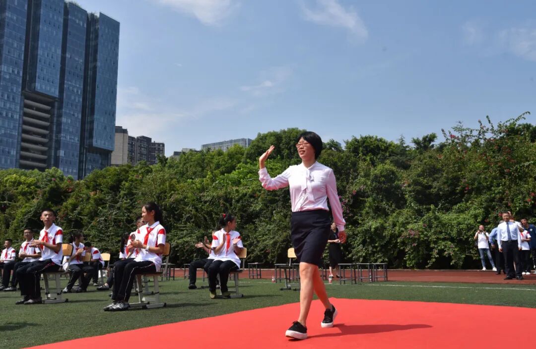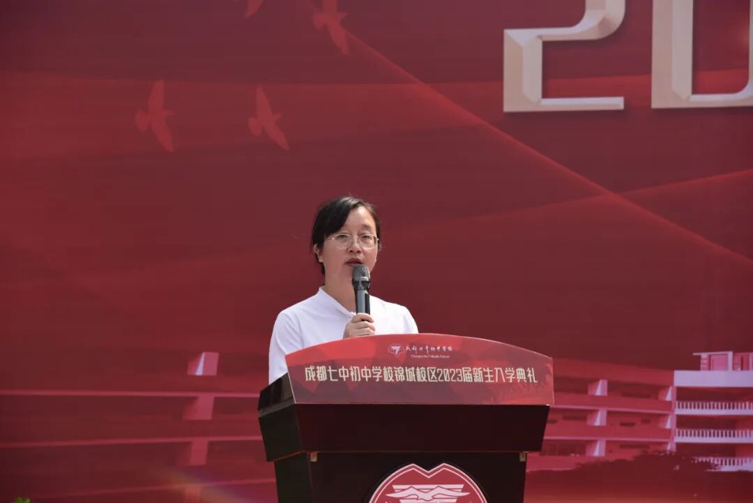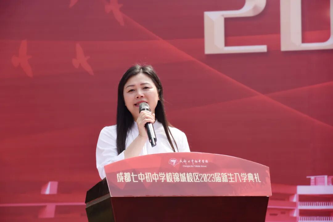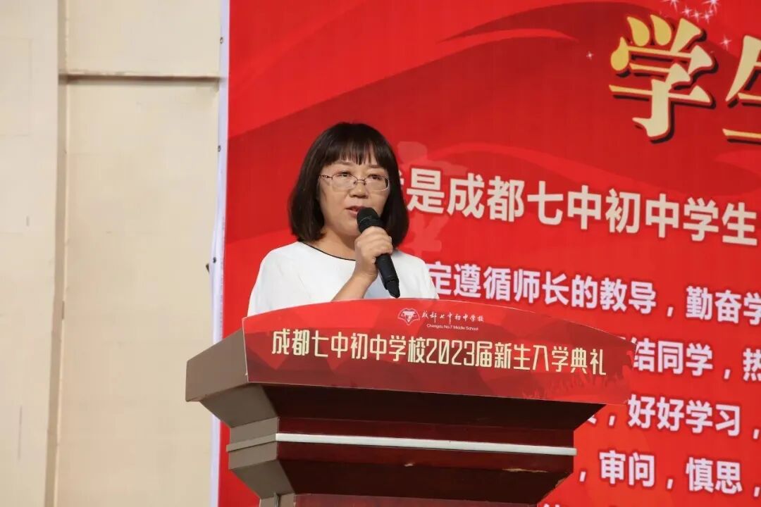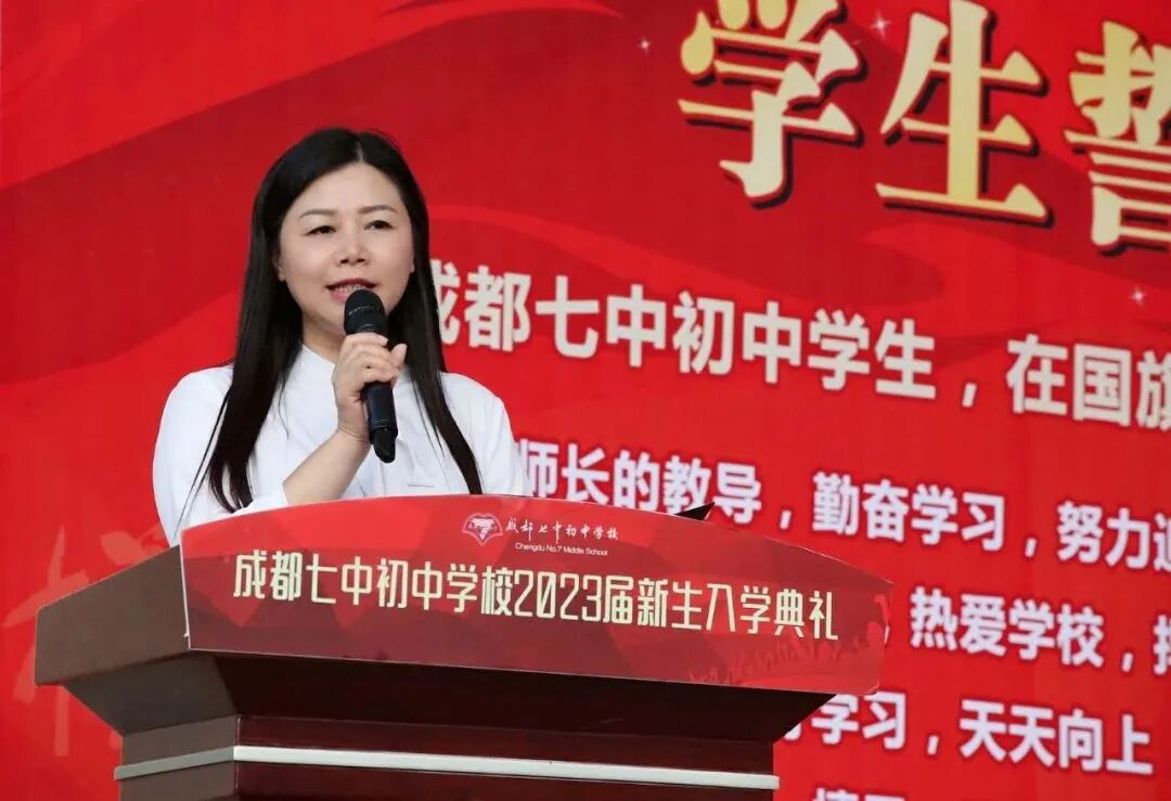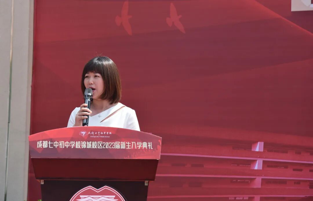 成都七中初中学校党总支书记、校长李笑非老师代表学校向新加入七初的同学们表示了热烈的欢迎。知本源,方致远。李校长回顾七初十二载的发展之路,从学生素养、课程创新到思维创生、多元评价等方面的综合解读了学校的育人实践。同时,李校长也深情鼓励2023届新同学,要珍惜时光,把握当下,潜心向学,追求卓越,让“审是迁善,模范群伦”成为自己心中的永恒信念!