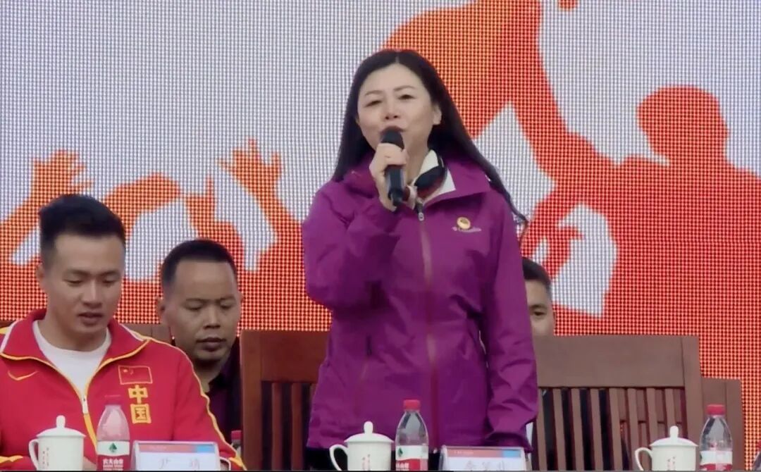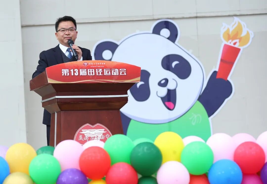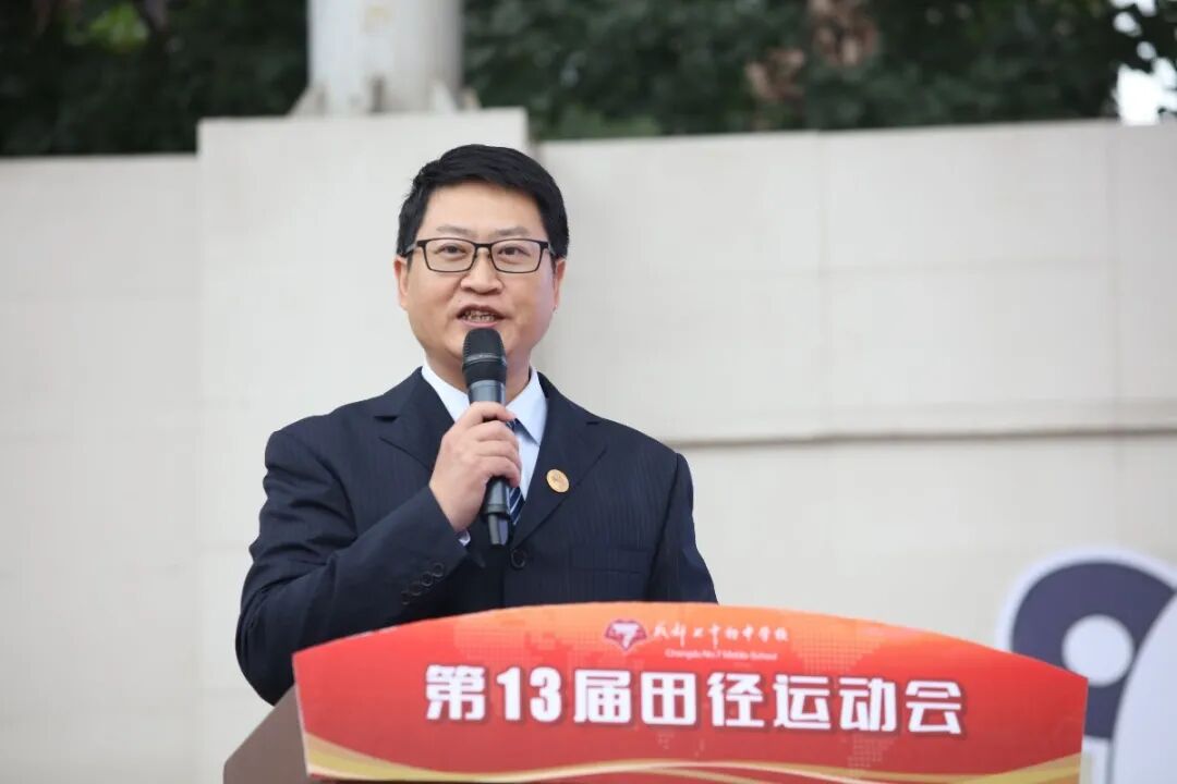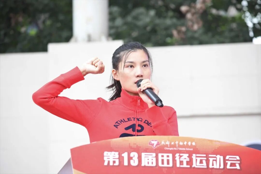 成都七中初中学校党总支书记、校长李笑非老师宣布成都七中初中学校第13届田径运动会开幕,现场掌声雷动,掀起了开幕式的高潮。