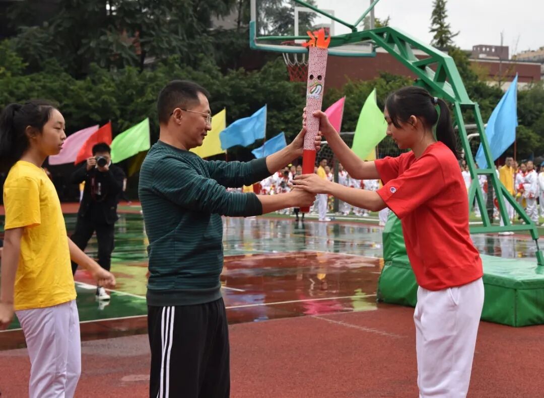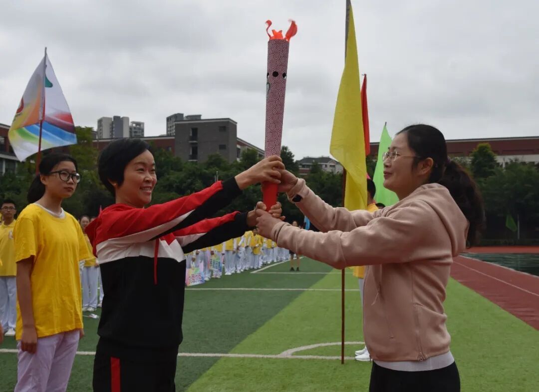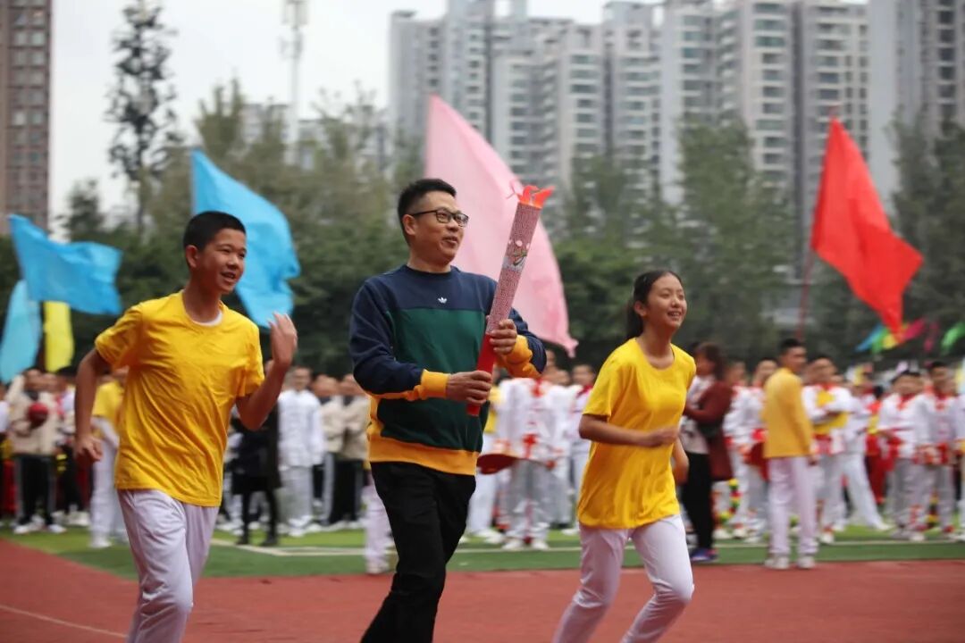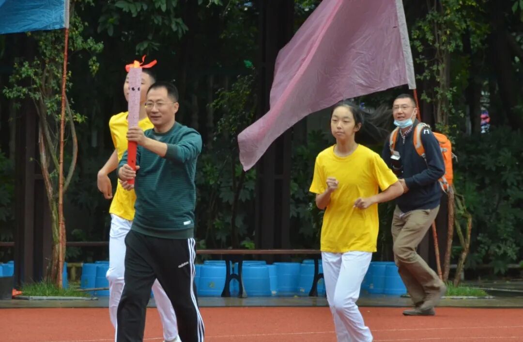 火炬,是引领者,领跑七初学子对更高、更快、更强的追逐,也传递七初的文化血脉,把“审是迁善 模范群伦”融入每个人的心中。成都七中初中学校党总支书记、校长李笑非老师点燃火炬。火炬经两校区教师代表卿立华老师、黄美琼老师、钟华老师、江缘老师、曹登勇老师、韩帅老师逐棒接力,最后由上届校运会女子跳远纪录的保持者2021届1班马静怡同学完成最后一棒。传递火炬仪式预示我校运动会要达到一个新的境界,也预示着成都七中初中学校一校两区的发展,将达到新的高度。