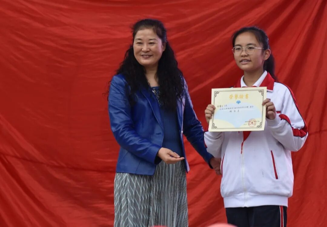 成都高新区桂溪街道办副主任胡小玲女士同会歌设计者2022届7班张馨予同学一起揭晓本届运动会会歌《赢在青春》,并为张馨予同学颁发会歌创意设计特等奖。