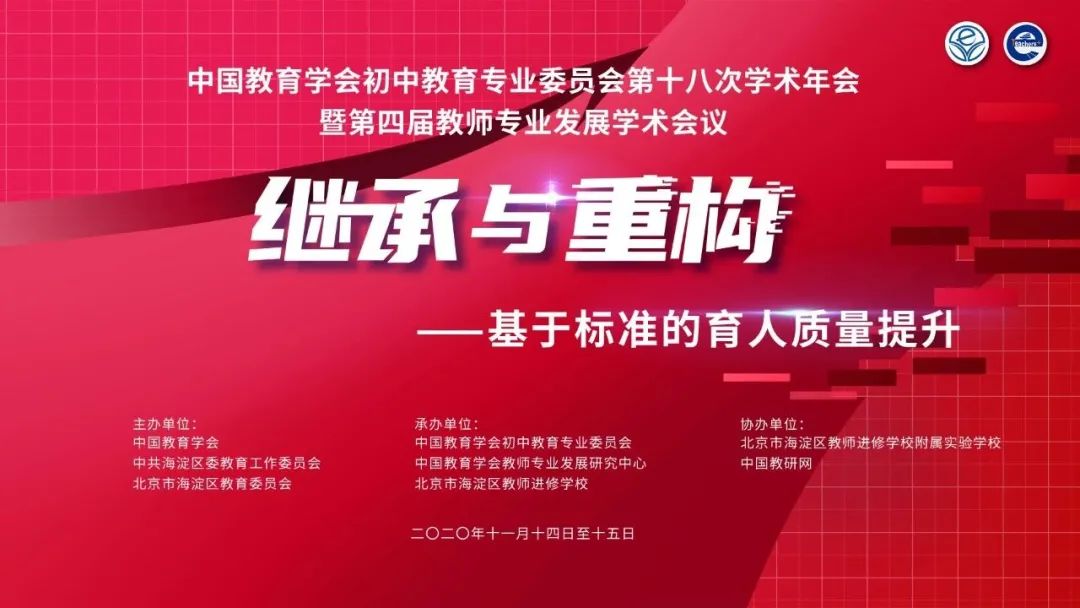 为贯彻全国教育大会精神,落实中共中央、国务院和教育部相关文件精神,聚焦新时代初中教育改革发展方略和未来教师的角色转型与素养提升,深入探讨初中教育质量提升的路径与策略。2020年11月14日-15日,中国教育学会初中教育专业委员会第十八次学术年会暨第四届教师专业发展学术会议在北京海淀举行,大会由中国教育学会、海淀区教委主办,中国教育学会初中教育专业委员会、中国教育学会教师专业发展研究中心、海淀区教师进修学校承办。大会主题为“继承与重构——基于标准的育人质量提升”。
