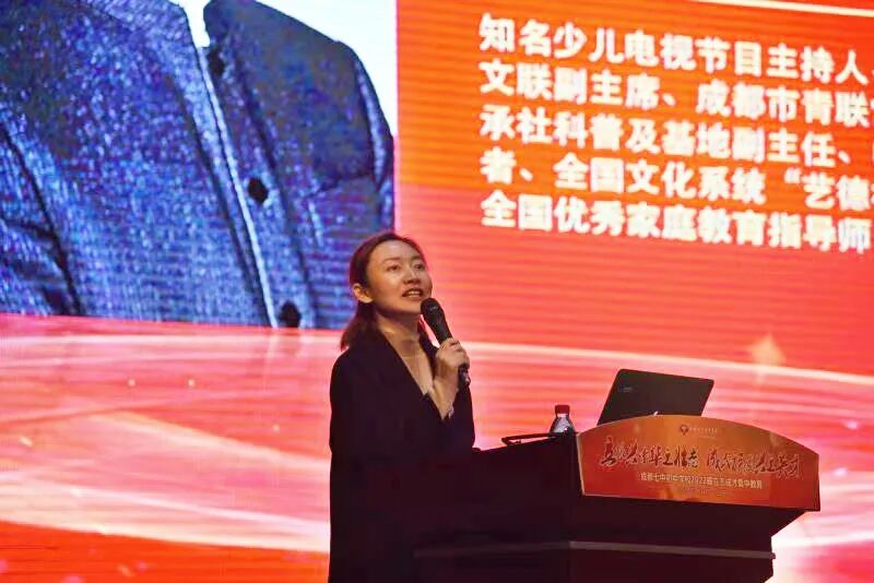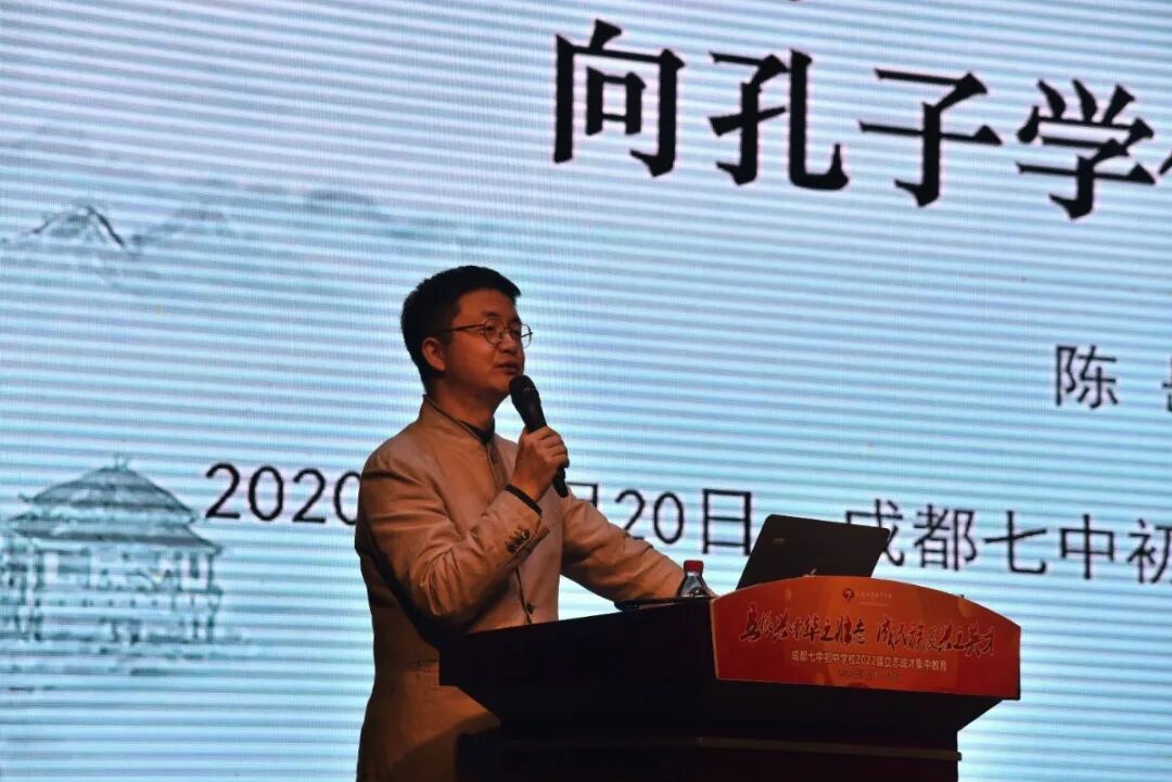 第一场报告是由成都电视台少儿频道节目主持人、制片人、总监陈岳叔叔为我们带来的“诵读《论语》 向孔子学什么”讲座。陈岳叔叔给同学们讲述了论语的重要性,并用精妙的语言告诉大家怎样从论语中学到孔子的人生哲学以此来明确自己的人生目标。他总结出论语的三个体系——价值体系、知识体系、文化体系,并传授给了同学们古代读书法的智慧,最后叮嘱大家要多读论语,把孔子作为一生的导师,把论语作为一生的教材。